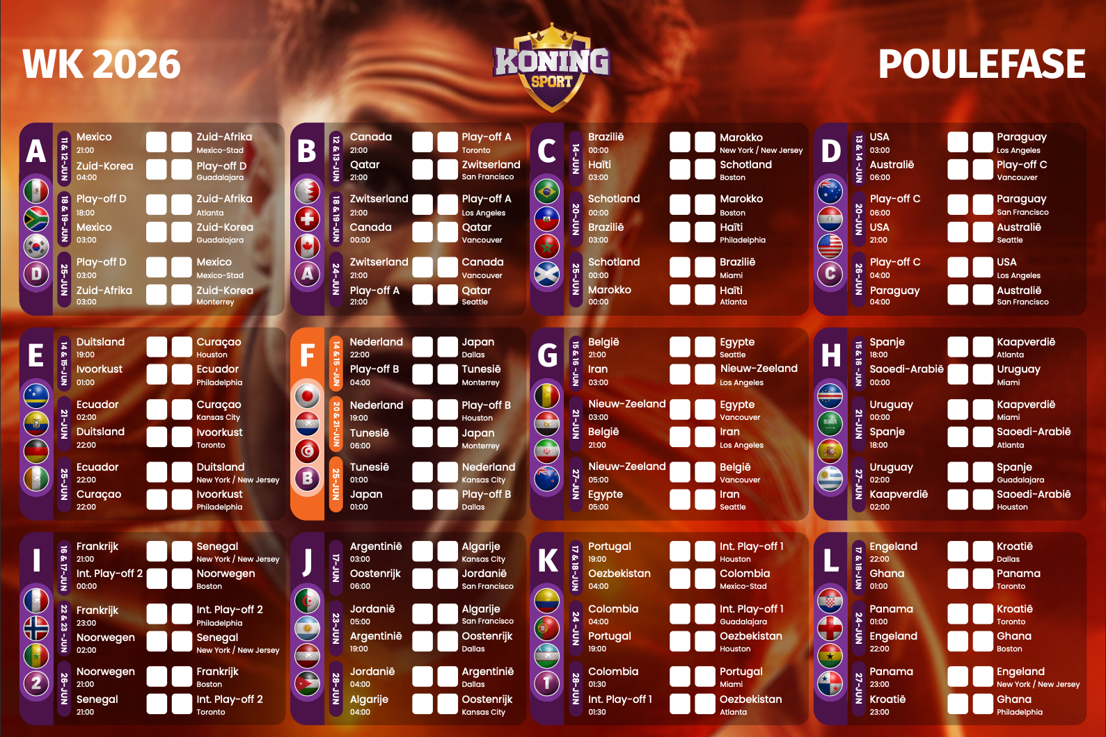 Koning Sport biedt een Koninklijk gemakkelijk WK speelschema die je op kan hangen in de kantine, op kantoor of bij je thuis. Binnen het schema op de WK Poster die te downloaden is in PDF, zijn de speeldata van de WK wedstrijden van Nederland makkelijk terug te vinden.
